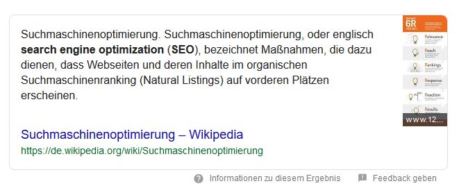 Es können ebenso Bilder in Featured Snippets dargestellt werden. Dabei muss das Bild und die Antwort nicht zwingend von der gleichen Domain bzw. Seite sein. Deshalb lohnt es sich Bilder ebenfalls für die organischen Suchergebnisse zu optimieren.